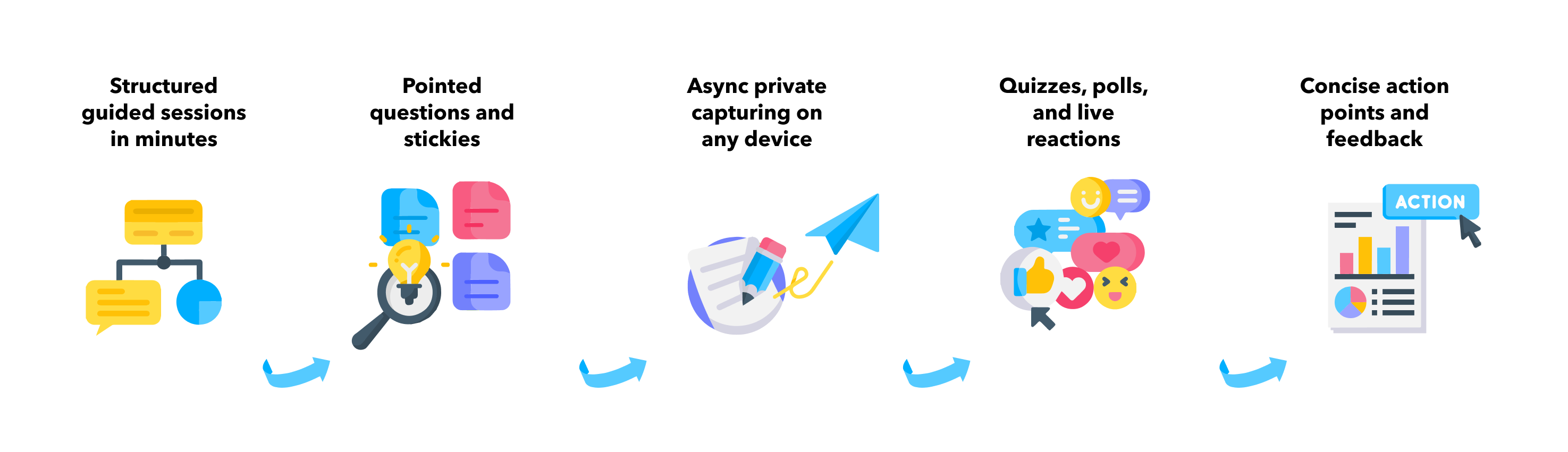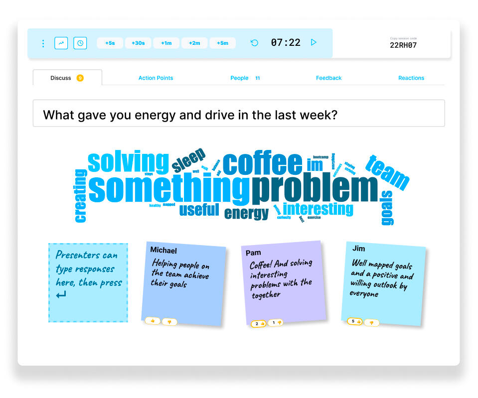 Capturing sticky notes or input from a group can waste time when it's done during a meeting, and people can be less likely to participate when they see that their thoughts might be covered by someone else. Interacts allows for people to capture their feedback in private and in their own time before the session, so time together can be spent on what's most important.