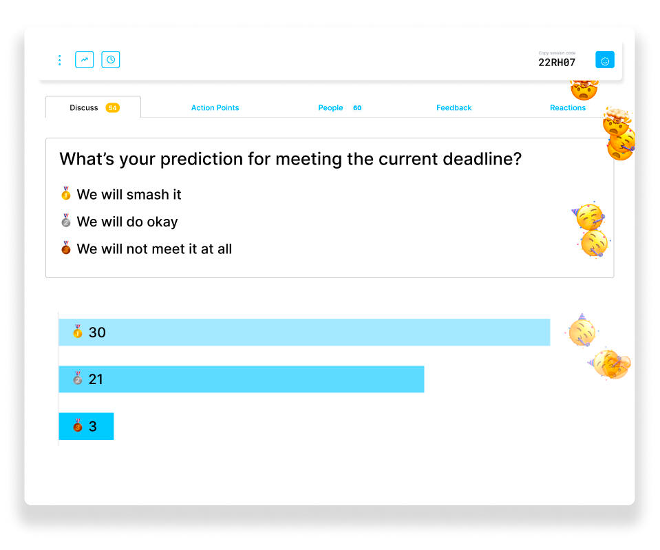 Quizzes and polls can be used to create fun interactions that boost morale, get people thinking differently, or teaching in a fun way. Interacts provides templates for games, trivia challenges, and more. Also, Interacts lets everyone reaction with emojis in real-time so you get a feel for attention, and understand the group's sentiment as you go.