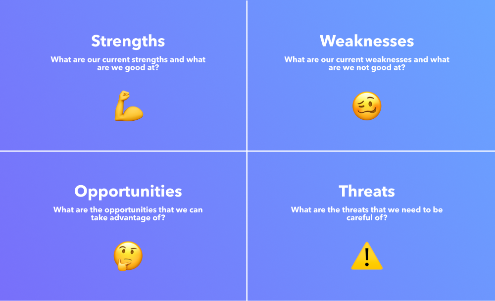 - Weaknesses: What are our current weaknesses and what are we not good at?